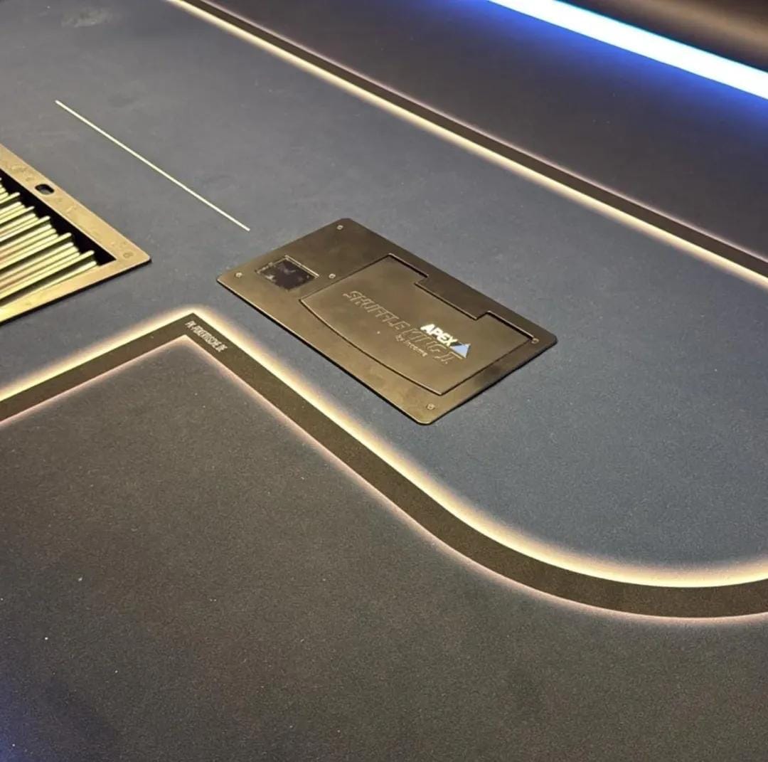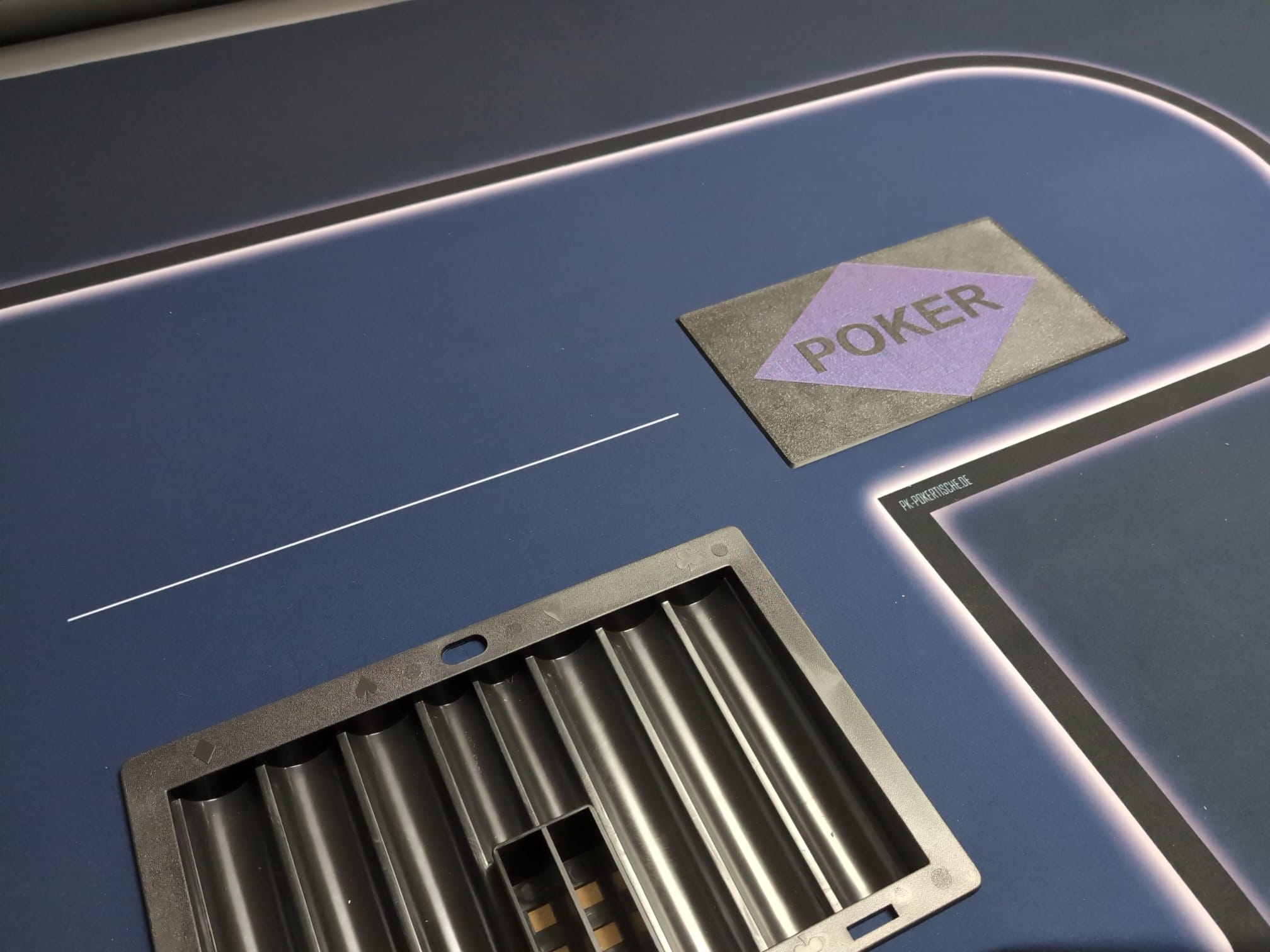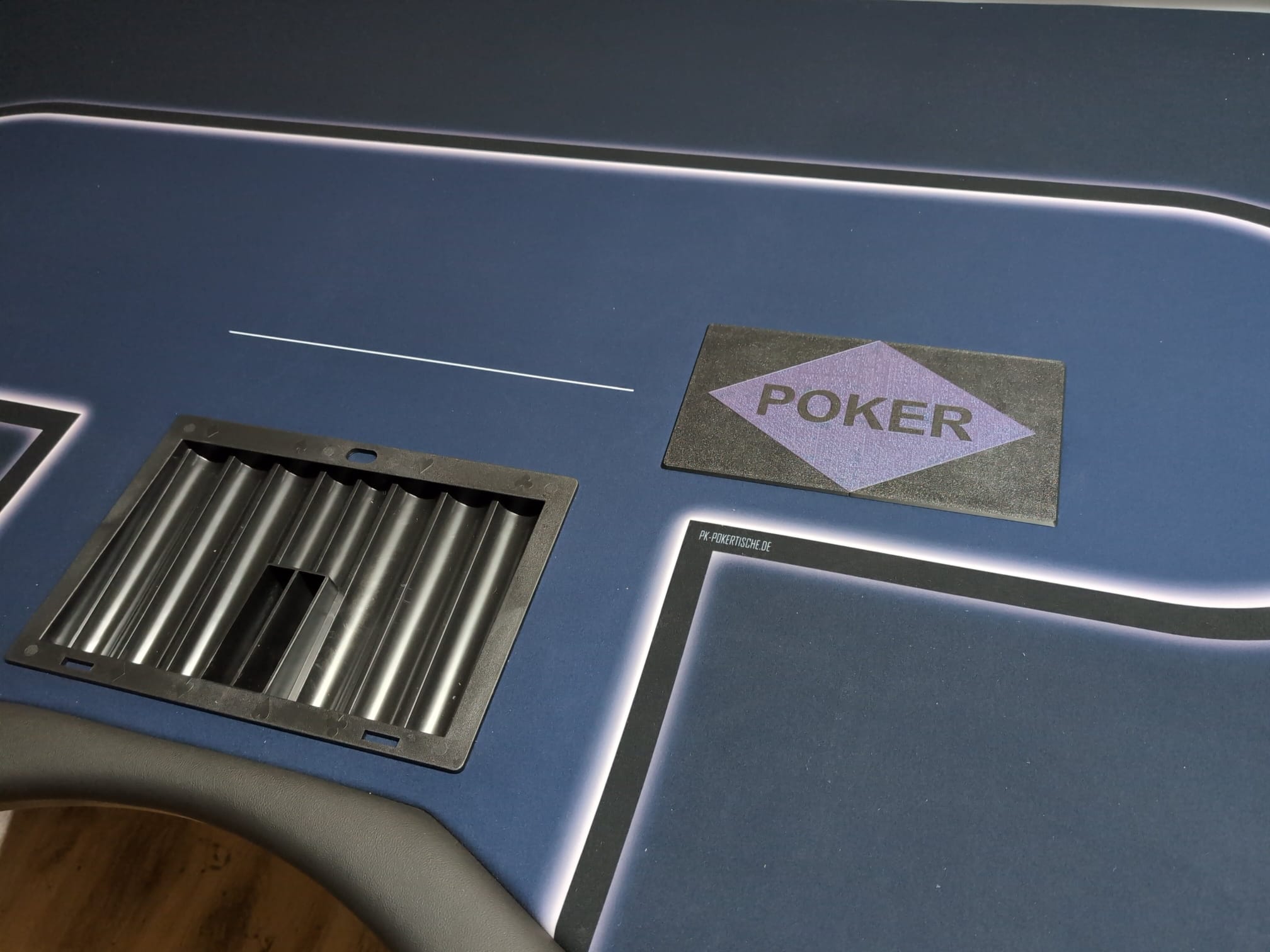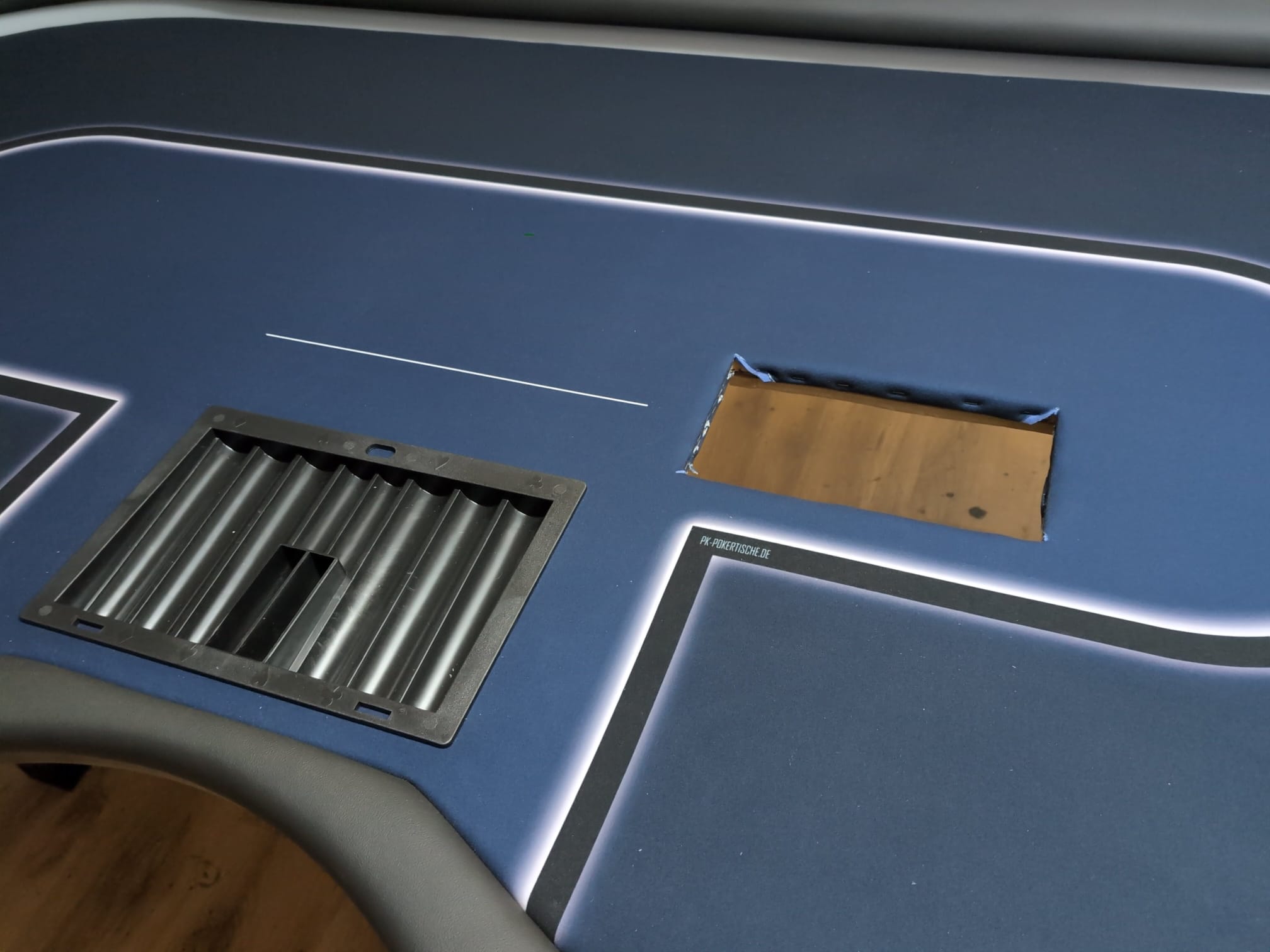 Hochwertige Abdeckung speziell für Karten Mischmaschinen Öffnungen geeignet. Diese Abdeckung wurde entwickelt, um Löcher und Öffnungen in Ihren Tischplatten sauber und professionell zu verdecken. Sie passt sich optimal an bestehende Strukturen an und bietet eine nahtlose Oberflächenfinish. Ideal für Pokertische und andere Spieltische, die eine ästhetische Lösung für technische Durchbrüche benötigen. Gerne auch mit eurem eigenen Logo oder Schrift.